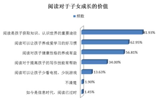 调查数据显示,大多数家长认可“阅读是孩子获取知识、认识世界的重要途径”,以及对孩子健康习惯的养成具有重要意义,也有家长比较看重阅读对于游戏、电视等的替代作用,主要是希望借助阅读挤压孩子玩电子产品、看电视的时间。总体上,仅有极少数受访家长认为阅读已过时。