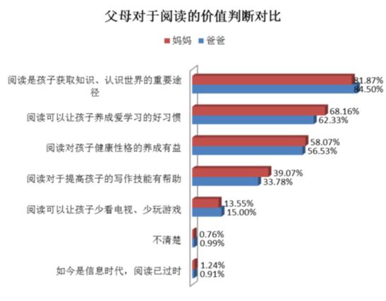 《报告》就此话题进行的交叉分析显示,在阅读对于子女成长价值认知上,爸爸和妈妈略有差异,爸爸相对更加认可阅读在帮助孩子获取知识方面的价值,而妈妈则相对更加认可阅读对于培养孩子学习习惯、性格养成以及具体写作技能等的提升方面的价值。