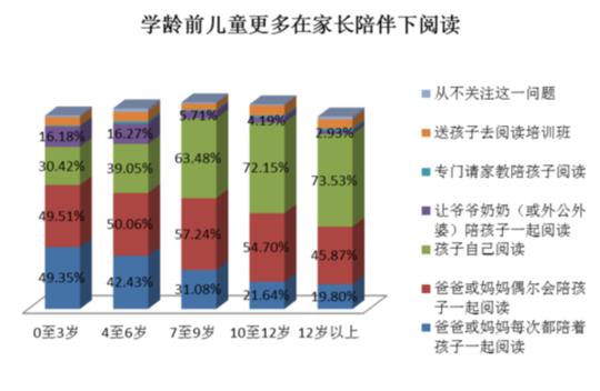 亲子阅读被认为是亲子关系培养的有效途径,到底有多少父母经常陪伴自己的孩子阅读?《报告》针对该话题的调查数据显示,有30.57%的受访家长能够经常陪伴孩子阅读,多数家庭更多时候是让孩子自己阅读?!侗ǜ妗贩治鋈衔鬃釉亩恋谋壤胱优哪炅涿芮邢喙?,学龄前儿童由父母陪伴阅读的比例相对较高,而子女已入学(小学或初中)的家长则更多地让孩子自行阅读。调查中,也有少部分家庭的孩子经常由爷爷奶奶或外公外婆陪伴阅读。