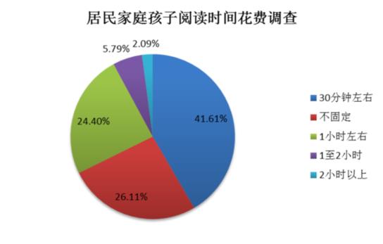 在各种兴趣班大行其道的当下,孩子们的课余时间变得异常稀缺,他们每次用在阅读上的时间最能反映居民家庭在亲子阅读上的积极性?!侗ǜ妗肥菹允?,超四成的受访居民家庭未成年子女每次阅读的时间在30分钟左右,占比41.61%,整体0.5至1小时的阅读时长占比66.01%。